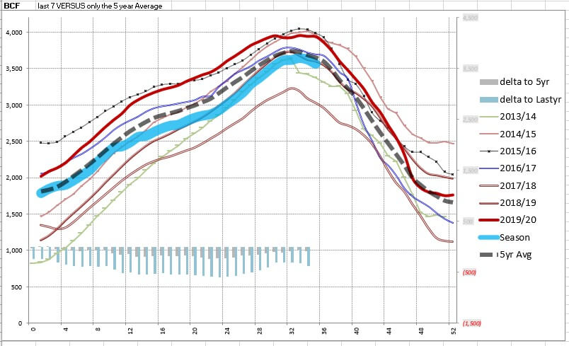 This represents a net decrease of 59 Bcf from the previous week. Stocks were 375 Bcf less than last year at this time and 86 Bcf below the five-year average of 3,650 Bcf. At 3,564 Bcf, total working gas is within the five-year historical range.