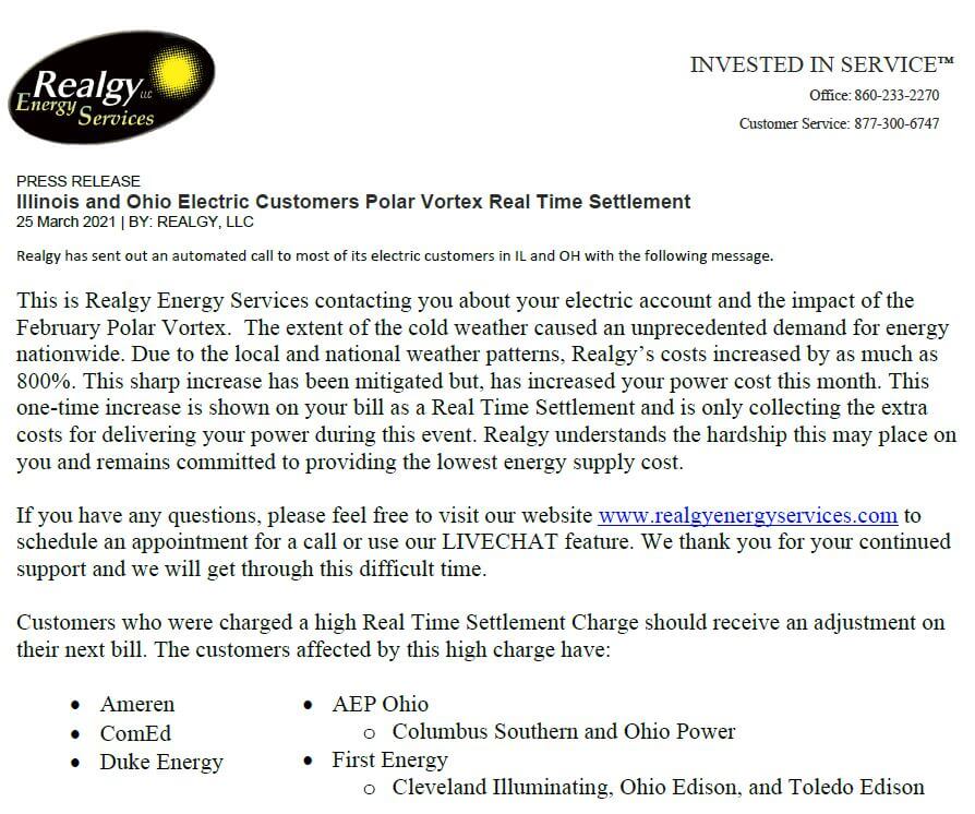 Realgy will continue to serve customers in Illinois, Indiana, and Ohio without interruption or change.