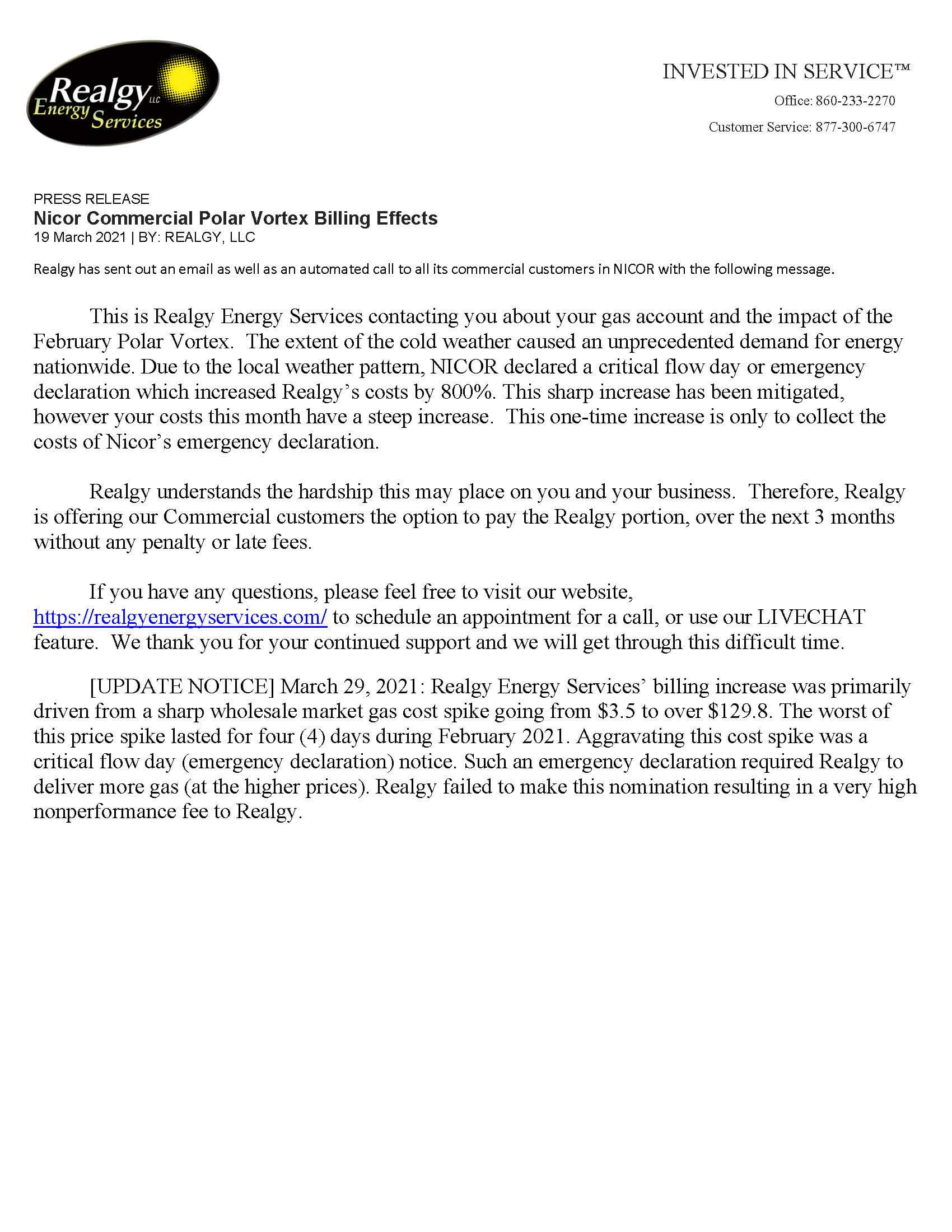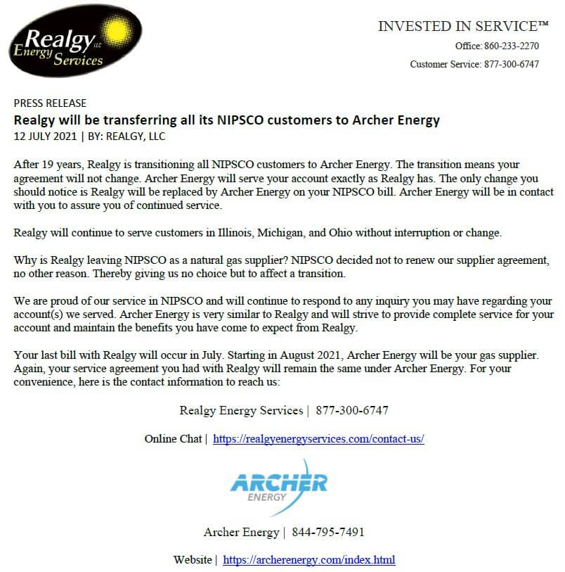 Realgy will be transferring all its Michigan customers to Michigan Natural Gas
