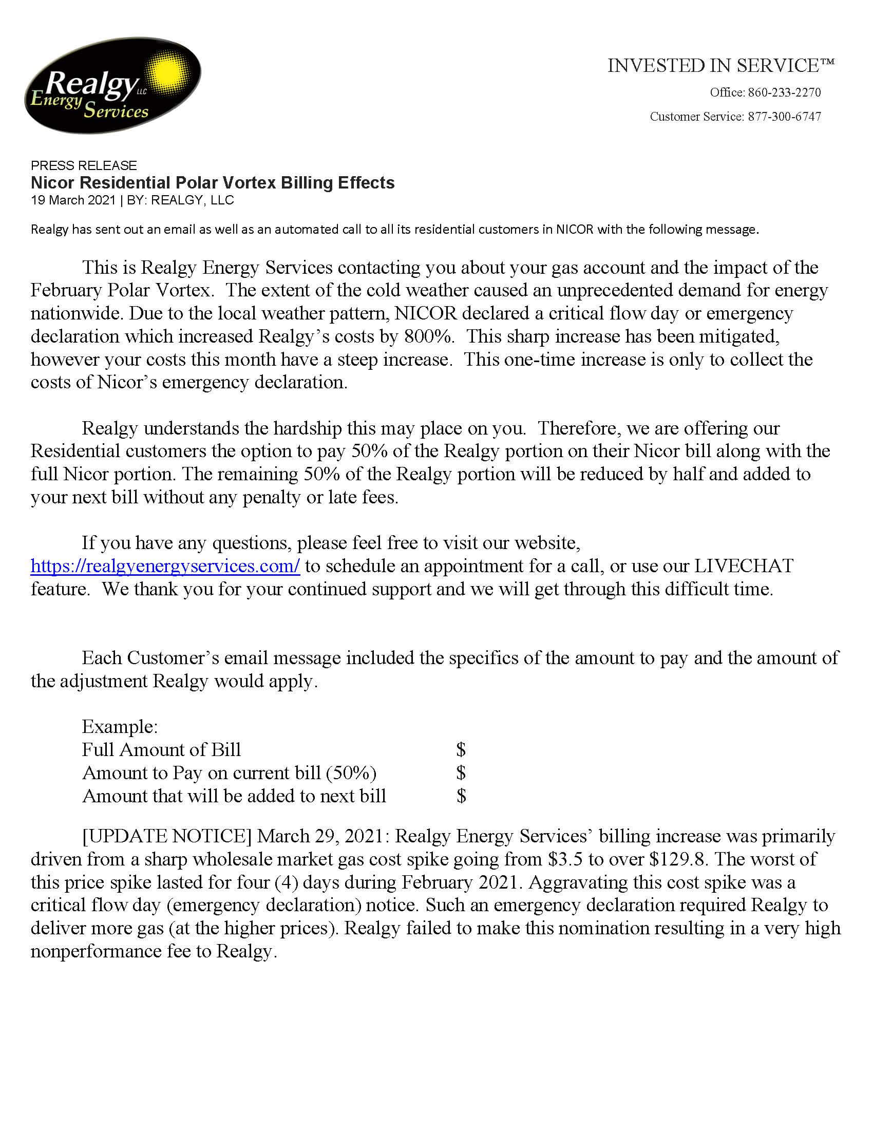 Your last bill with Realgy will occur in November. Starting in December 2022, MNG will be your gas supplier. Again, your service agreement you had with Realgy will remain the same under MNG. For your convenience, here is the contact information to reach us: